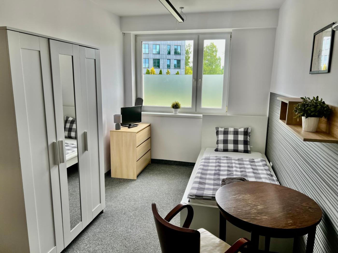 Studio. The studio offers a carpeted floor and heating, as well as a private bathroom featuring a shower. The well-equipped kitchen features a stovetop, a refrigerator, kitchenware and a microwave. The studio provides a tea and coffee maker, a dining area, a wardrobe, a flat-screen TV, as well as ancourtyard view. The unit offers 1 bed. Studio - 2 osobowy. Powierzchnia pokoju ok.: 14 mkw. ;