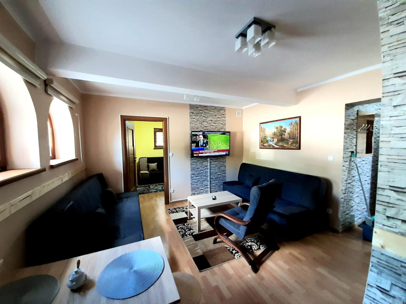 Apartament z 2 sypialniami. Boasting a private entrance, this apartment includes a kitchenette, 2 bedrooms and 1 bathroom with a walk-in shower and a bidet. The fully equipped kitchenette has a stovetop, a refrigerator, kitchenware and a microwave. The apartment offers a flat-screen TV with cable channels, a dining area, a wardrobe, an electric kettle as well as ancourtyard view. The unit has 4 beds. Apartament - 8 osobowy. Powierzchnia pokoju ok.: 40 mkw.