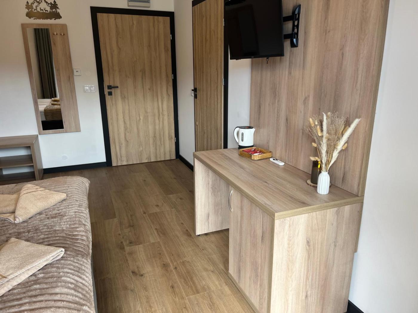 Pokój Dwuosobowy z widokiem na góry. The double room offers a tea and coffee maker, a wardrobe, a balcony with mountain views as well as a private bathroom boasting a walk-in shower. Powierzchnia pokoju ok.: 19 mkw. ;